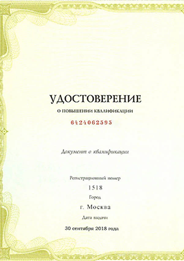 • 2022 г. — ООО «Многопрофильный Учебный Центр дополнительного профессионального образования Центр Профессиональной подготовки» (повышение квалификации по программе «Наркология»).