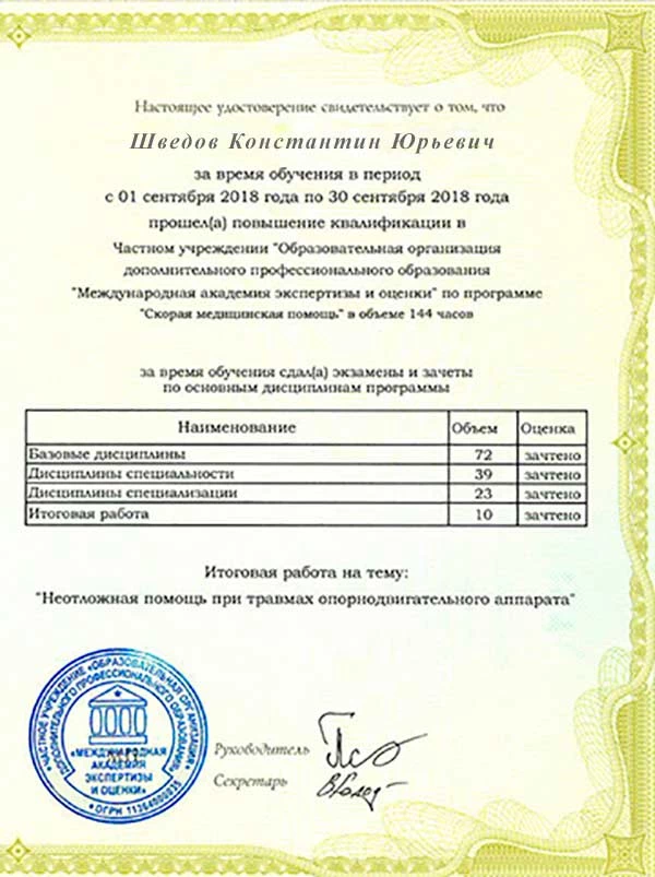 • 2018 г. — ЧУ ОДПО «Международная академия экспертизы и оценки» (повышение квалификации по программе «Скорая медицинская помощь»);
